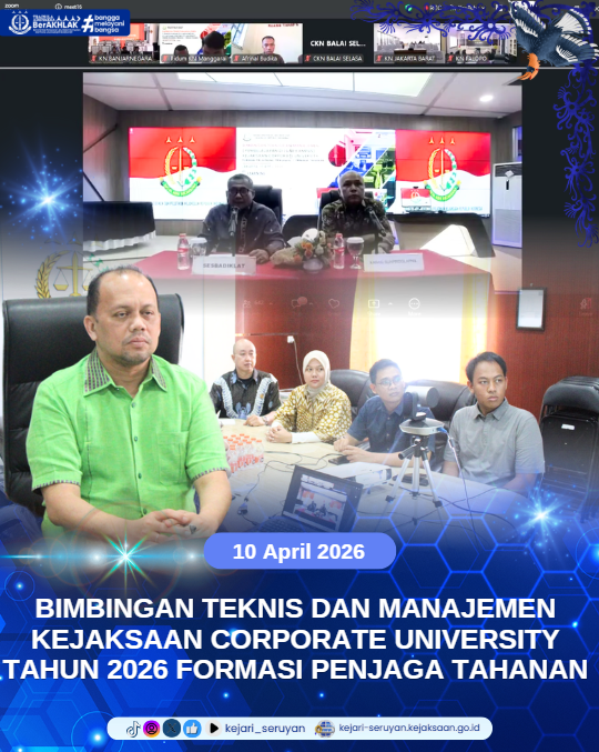 Pada Hari Jumat, Tanggal 10 April 2026, Pukul 08.00 WIB sampai dengan selesai, bertempat di Ruang Vicon Kejaksaan Negeri Seruyan Kabupaten Seruyan, Kepala Kejaksaan Negeri Seruyan Bapak Andre, S.H.,M.H., mengikuti kegiatan Bimbingan Teknis dan Manajemen (Pembelajaran di Luar Kampus) Kejaksaan Corporate University Tahun 2026 Formasi Pelaksana Pengawal/Penjaga Tahanan bersama Kepala Seksi Tindak Pidana umum dan Para Pegawai Kejaksaan Negeri Seruyan Formasi Pengawal Tahanan. Bahwa kegiatan tersebut bertujuan untuk pengembangan kompetensi melalui pembelajaran secara terus-menerus agar tetap relevan dengan tuntutan organisasi.